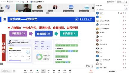 都琳从人工智能赋能教育的新趋势切入,分析了“师-生-AI”协同课堂教学模式的创新理念,结合西北工业大学《概率论与数理统计》课程的教学实践,详细阐释了将知识单元教学按“导论课-研讨课-总结课”三步法组织的创新设计。都琳还分享了AI技术在实现个性化学习、增强师生互动、优化教学评估等方面的具体应用案例,并针对智能时代教师角色转型、教学场景重构等关键问题提出了独到见解。报告结束后,都琳与线上线下参会老师进行了互动交流。参会教师纷纷表示,报告内容“既有前沿理论支撑,又具实操指导价值”,为探索AI与数学课程深度融合提供了新范式。