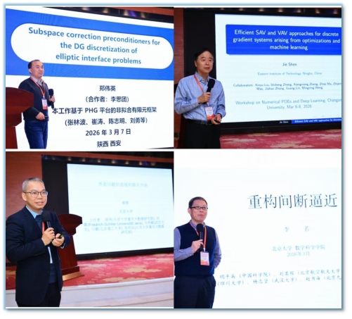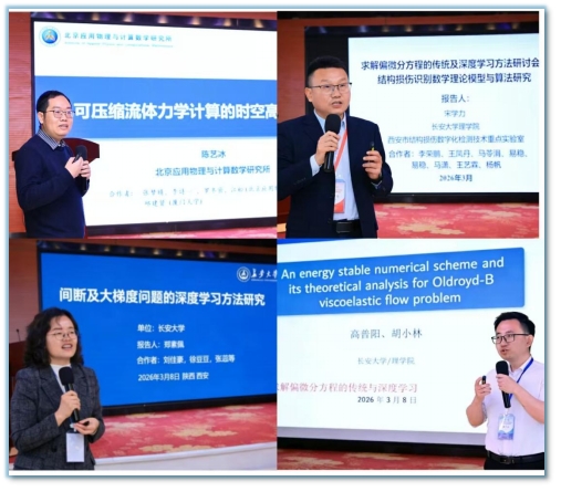 本研讨会聚焦偏微分方程的理论分析、高效算法及科学计算应用,旨在推动传统数值方法与深度学习技术的深度融合与创新发展。来自北京应用物理与计算数学研究所、中国科学院数学与系统科学研究院、清华大学、北京大学、复旦大学、上海交通大学、香港理工大学、宁波东方理工大学、长安大学等单位的20余位专家学者围绕椭圆界面问题的子空间校正预条件子、重构间断逼近方法、SAV方法在优化与机器学习中的应用、基于最优控制的生成模型、科学机器学习案例分析、Q-张量流的能量稳定格式、可压缩流体的时空高精度算法、深度学习在间断问题中的应用等主题作了精彩报告。各位报告人与现场参会人员展开了热烈的交流讨论,与会代表纷纷表示,报告内容前沿、视角多元,充分展现了传统数值方法与人工智能深度融合的广阔前景,拓宽了参会者的学术研究视野,为后续的科研工作提供了全新的思路与方向,也为高校之间的学术合作与人才交流搭建了重要桥梁。