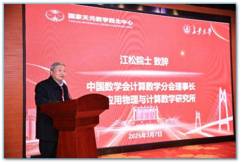 江松院士代表中国数学会计算数学分会致辞。他指出偏微分方程数值解始终是计算数学的核心问题,传统方法不断精进,智能方法异军突起,二者融合已成为国际主流趋势,也是我国抢占前沿赛道的关键着力点。他表示,中国数学会计算数学分会将一如既往团结并支持全国计算数学工作者,共同推动我国计算数学快速发展,为建设数学强国、科技强国贡献力量。