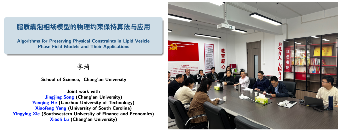 报告中,李琦围绕生物膜与细胞器动力学中的关键问题,系统介绍了脂质囊泡相场模型在描述囊泡形变、迁移及相互作用等复杂行为方面的研究进展。他指出,传统相场模型在体积与表面积约束的严格保持、能量稳定性以及数值计算效率等方面仍存在一定局限,并重点展示了其团队的最新成果:通过引入保守 Allen–Cahn 动力学与拉格朗日乘子方法,构建新型相场模型,实现了囊泡体积的精确保守和表面积约束的严格保持;进一步结合标量辅助变量方法,设计了线性、解耦且无条件能量稳定的数值格式,并将相关方法推广至流体耦合及多组分脂质囊泡模型。