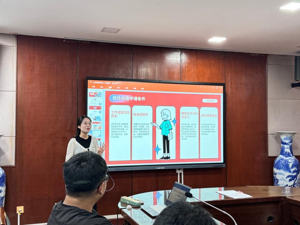 会上,周小娟围绕学生宿舍管理的各项规章制度与安全要点进行了详细解读。她强调,全体新生须严格遵守《长安大学学生公寓管理办法》《长安大学学生宿舍消防安全手册》等文件要求,这些制度既是维护宿舍秩序的基本保障,也是营造良好生活与科研休息环境的重要基础。针对校外住宿管理,周小娟明确,全日制研究生原则上应入住校内公寓,仅因西安工作居住、陪读陪护、跨校合作等特殊原因方可申请校外住宿,且研究生本人需自行承担校外住宿期间的安全责任,并定期向辅导员汇报情况。最后,她重点强调了宿舍与人身安全事项,严禁使用违规电器、私接电线、为电动车充电、使用明火、存放危险品、开展违规活动以及饲养动物等行为。同时,她提醒学生严格执行请销假制度,离校前须在学院系统报备去向与返校时间,以便辅导员及时掌握动态。