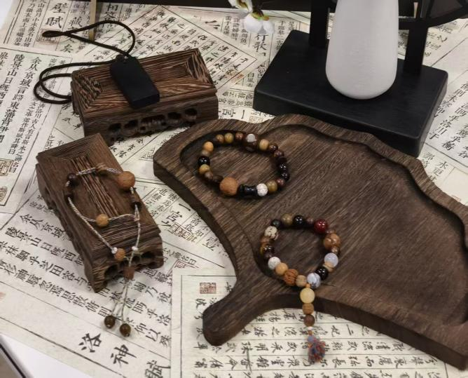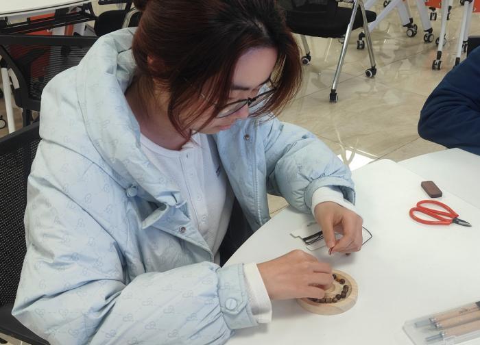 在体验环节中,同学们借助图文与视频教程,快速掌握了串珠的基础技法。各色珠子在指尖穿梭,制作出一件件精致的成品。大家纷纷表示,在专注串珠、搭配的过程中,大家暂时脱离了快节奏生活的压力与焦虑,感受到了“慢手工” 带来的治愈力量。同学们充分发挥创意,有的参考清代 “十八籽” 手串搭配珠子,有的通过雕刻无事牌表达自己的心境。