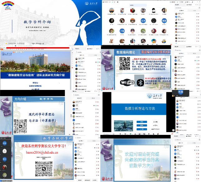 在两天的活动中,来自多所高校的数学、应用数学、统计学、数据科学等专业的同学云端相聚,共同聆听了学科总体介绍与多个研究方向团队的详细宣讲。首日晚,赵楠楠老师首先介绍了长安大学数学学科的基本情况、发展历程与未来规划。随后,宋学力教授团队就“数据建模方法与应用”展开介绍,衡子灵教授团队分享了“数据编码”的研究进展与成果。在自由交流环节,同学们积极提问,老师们耐心答疑。第二天的活动继续聚焦科研团队介绍,郑素佩教授团队、王长鹏副教授团队、包雄雄教授团队及刘敏副教授团队分别就“现代科学计算理论与方法”、“数据分析理论与方法”、“生物信息处理与建模”和“基础数学”等方向进行宣讲,充分展现了长安大学数学学科多领域、高水平的科研布局与人才培养环境。集中答疑环节通过问答的方式进一步增进了学生对各个导师、校外学生对长安大学的了解。