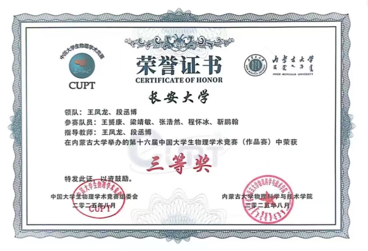 在全国赛捷报传来之前,我校学子已在区域比赛中展现出强劲实力。在中国大学生物理学术竞赛陕西省竞赛及西北地区赛中,我校学子斩获颇丰,共获得省级团体特等奖 2 项、一等奖 4 项、二等奖 2 项;个人奖项方面,获特等奖 4 项、一等奖 6 项、二等奖 2 项。这一系列成绩为最终全国奖项的取得奠定了坚实基础。