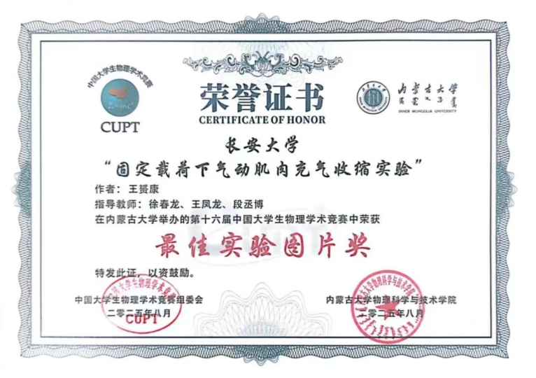 作为本次竞赛的校内组织单位,我院指导团队高度重视,精心组织全校学生参赛。在竞赛过程中,我校选派的学生代表队表现优异,在全国作品赛中经过多轮严格评审,最终荣获全国三等奖。在实验图片赛单元中,我校报送的五件作品中的《固定载荷下气动肌肉充气收缩实验》因设计巧妙、图像清晰、科学表现力强,荣获 “最佳实验图片奖”,充分展现了我校学子优秀的物理创新与实践能力。